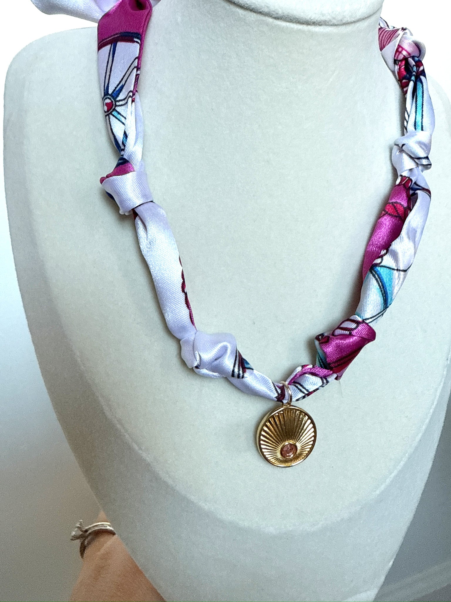 Pink and white scarf necklace with gold pendant. This scarf necklace is a one of a kind and has been this years best seller!