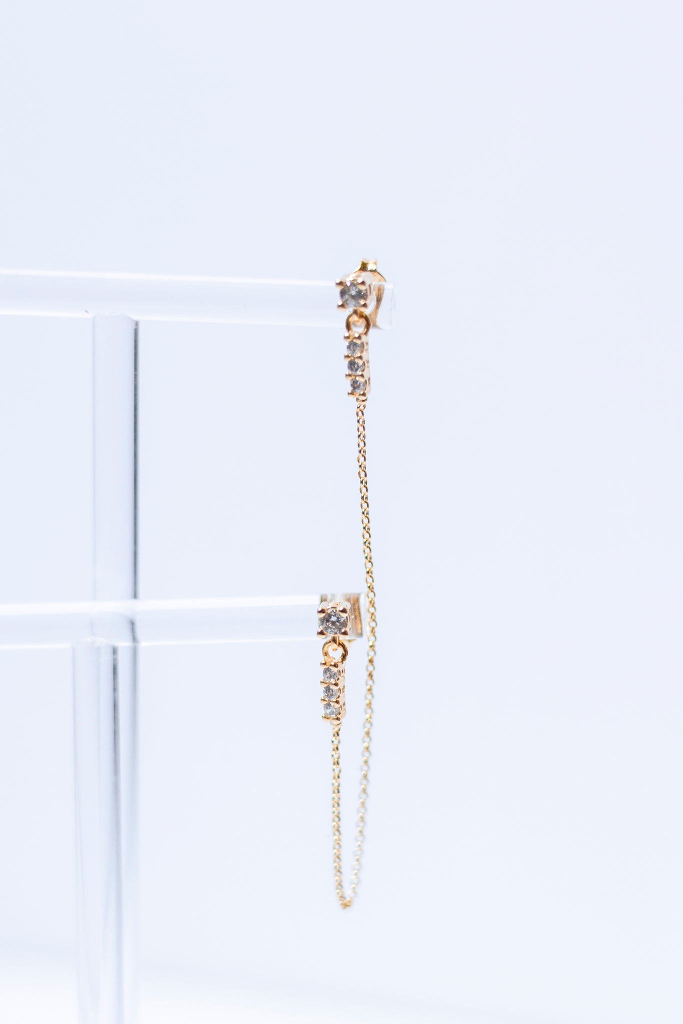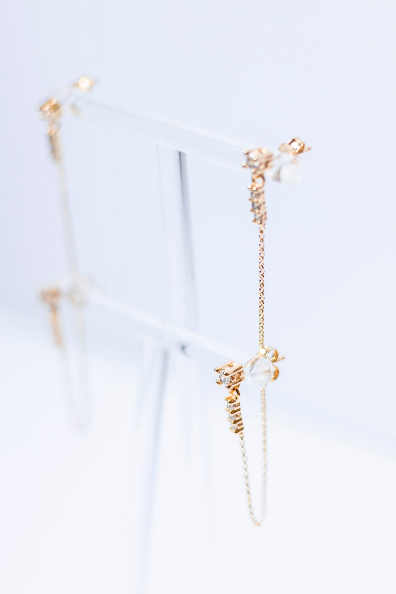 These stunning earrings are the perfect addition to your earring stack. Two CZ studs connected by an intricate gold-filled chain, these earrings elevate any look.